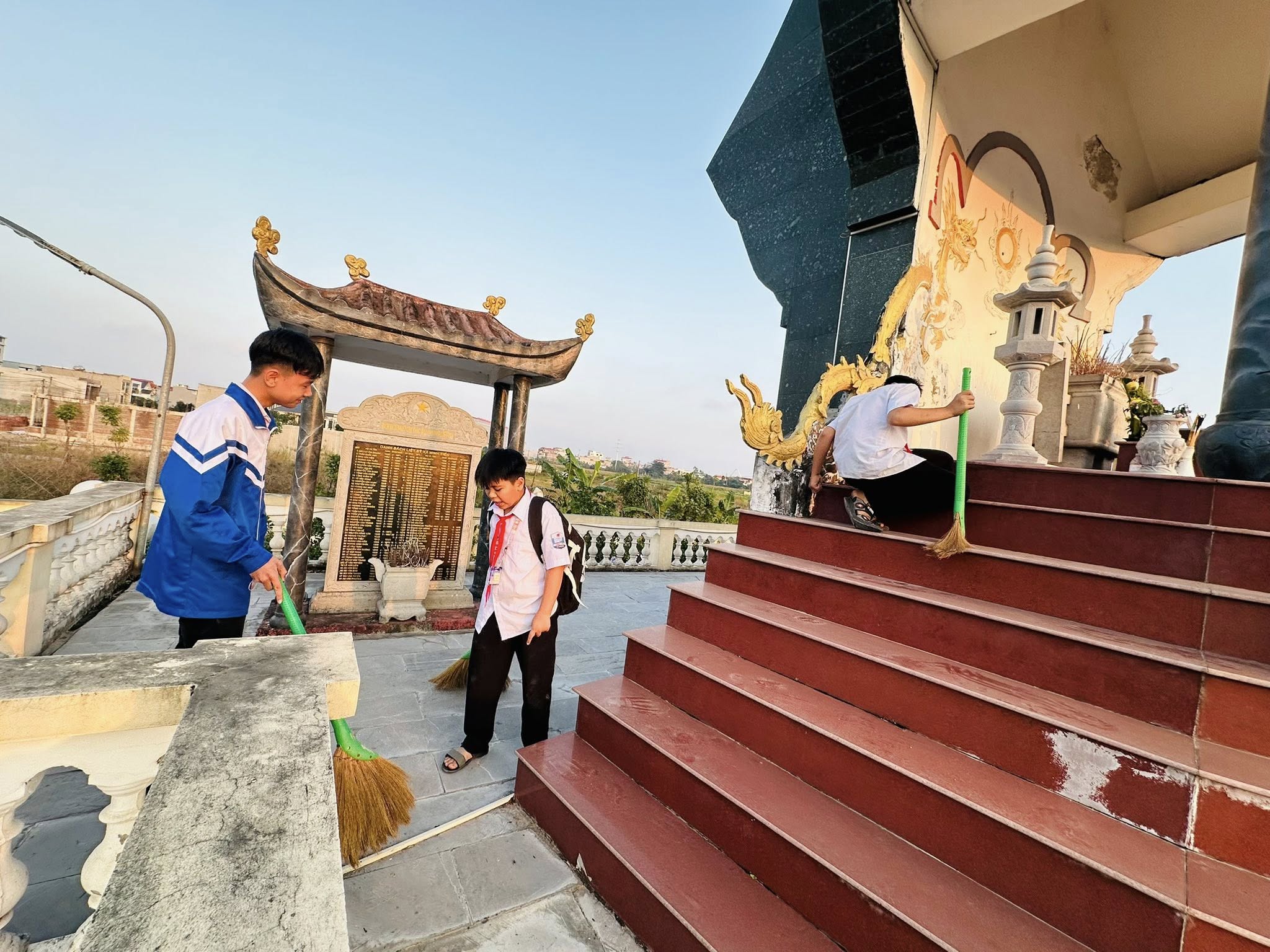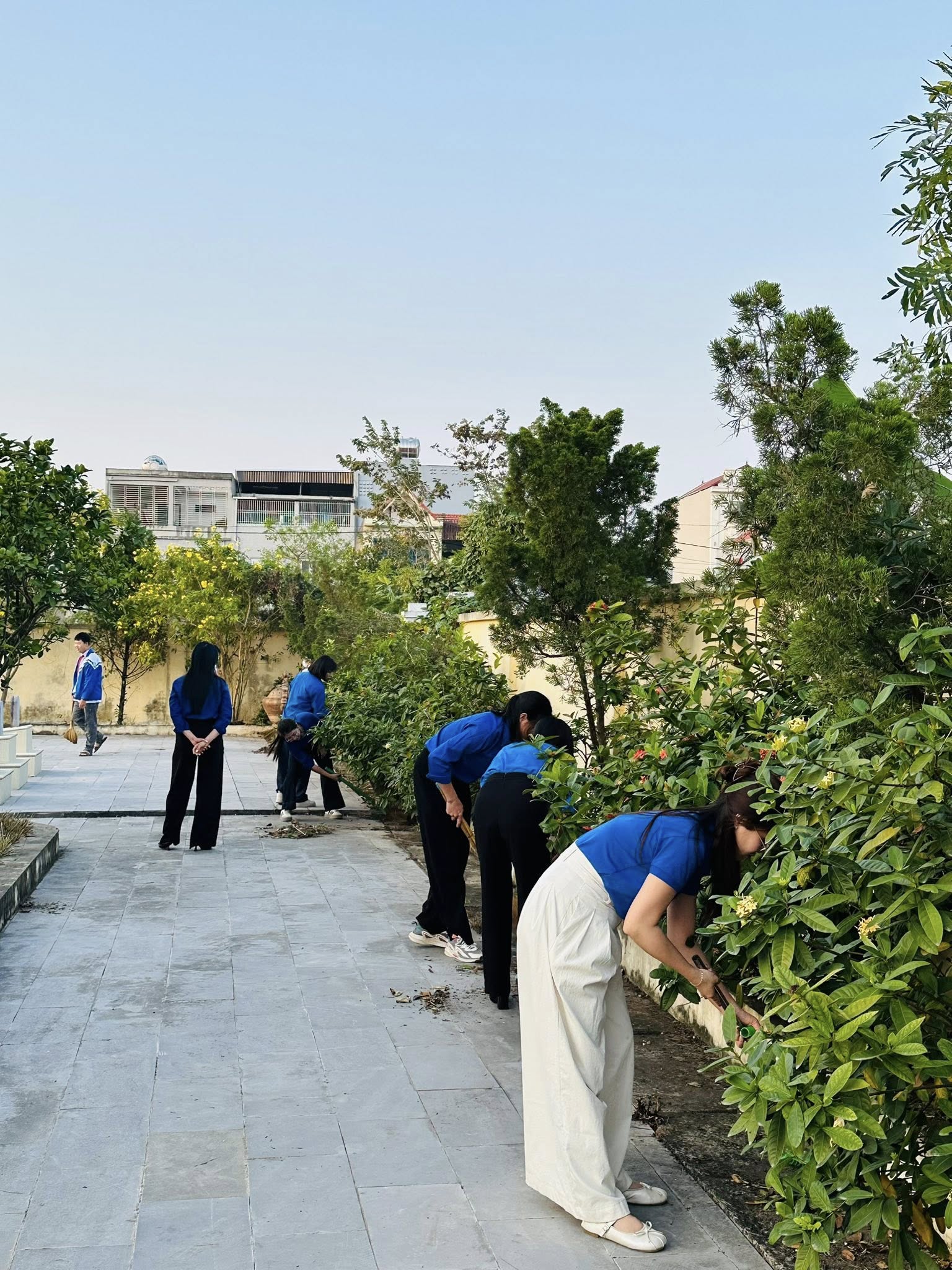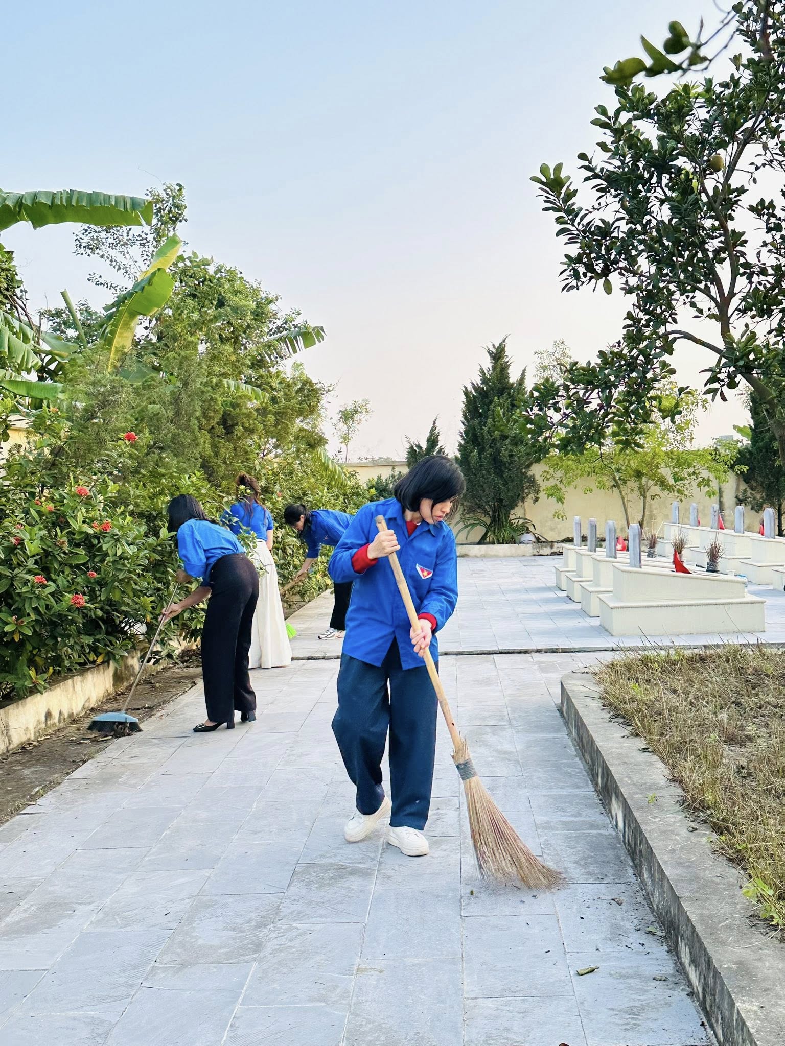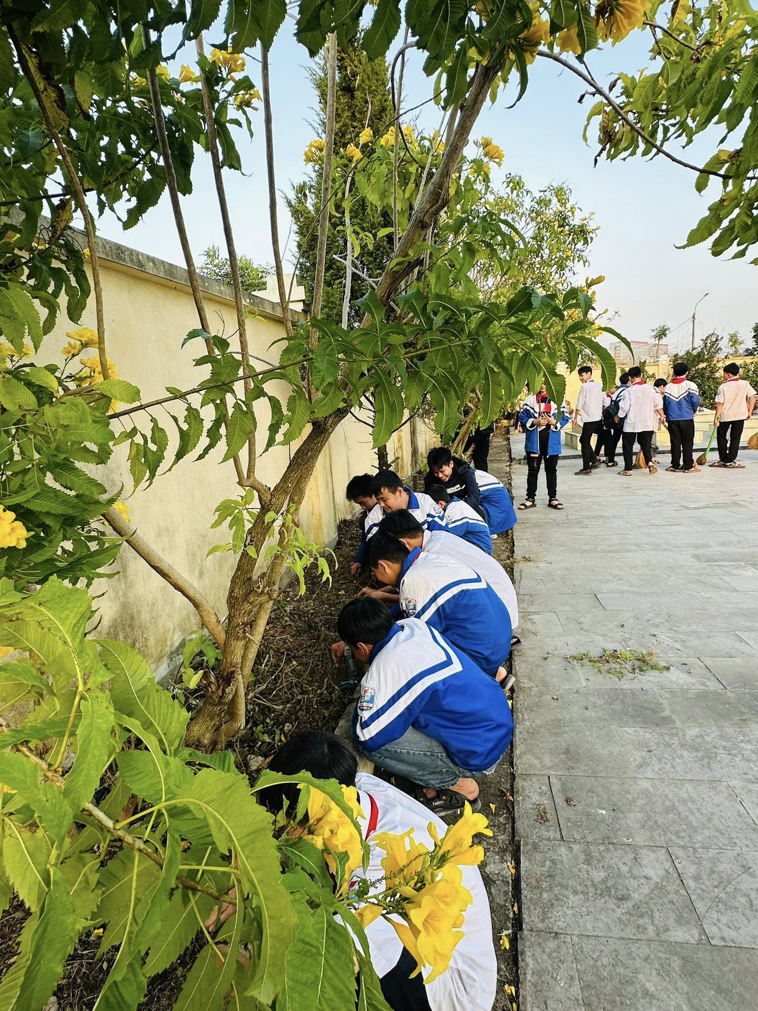 Các em đã cùng nhau dọn vệ sinh, nhặt cỏ, thu gom rác và chăm sóc cây xanh, góp phần giữ gìn cảnh quan sạch đẹp, trang nghiêm.