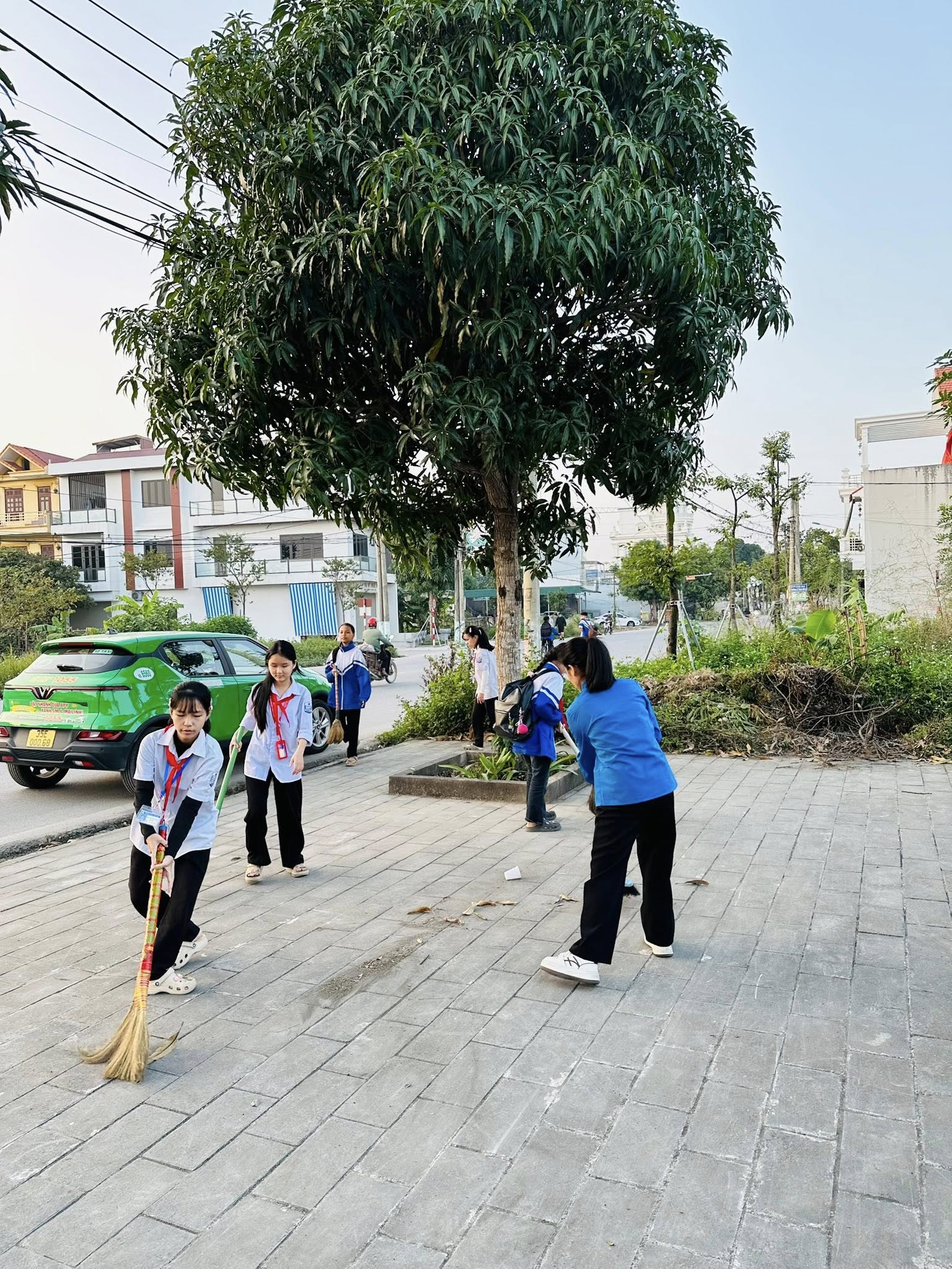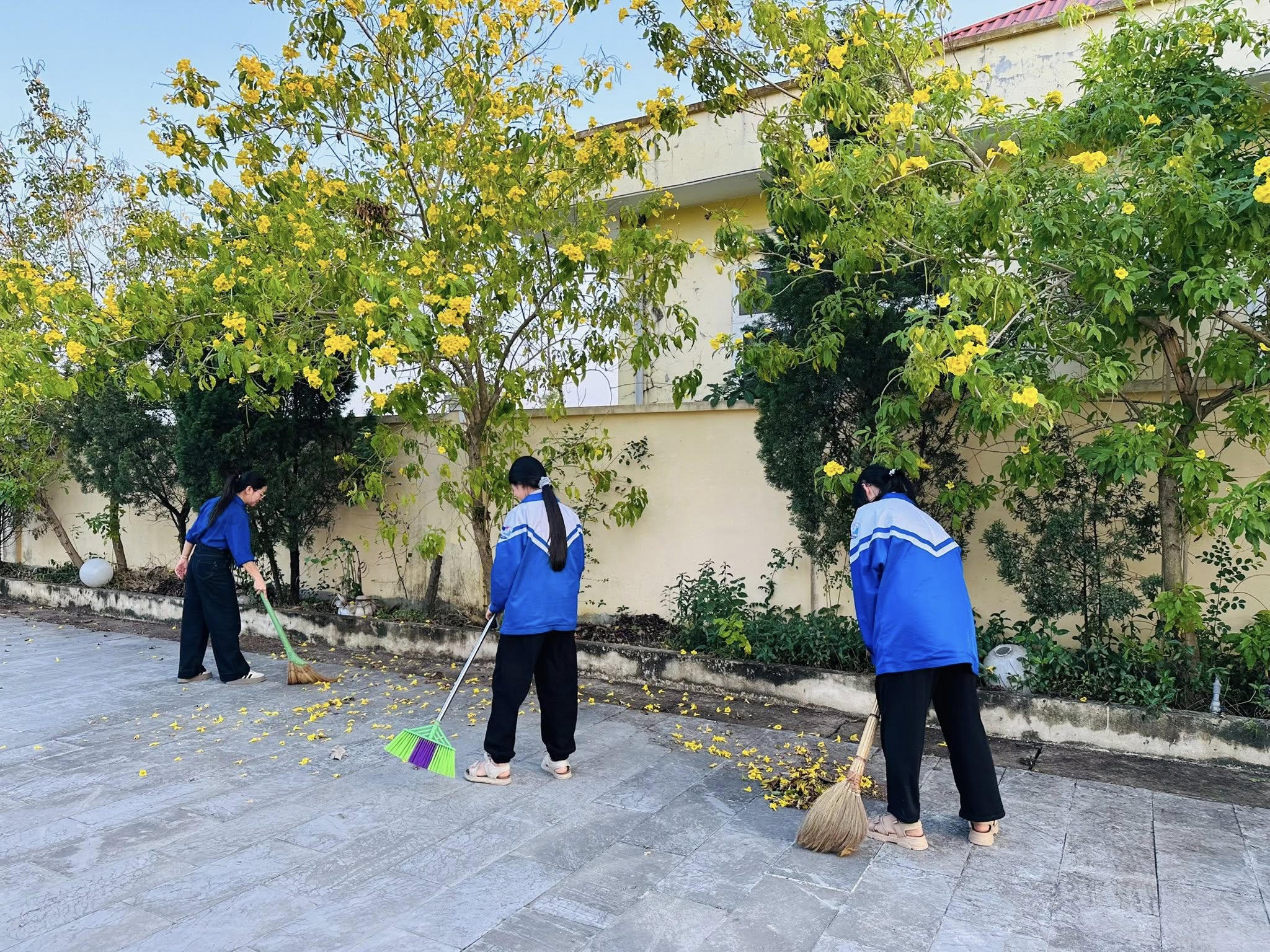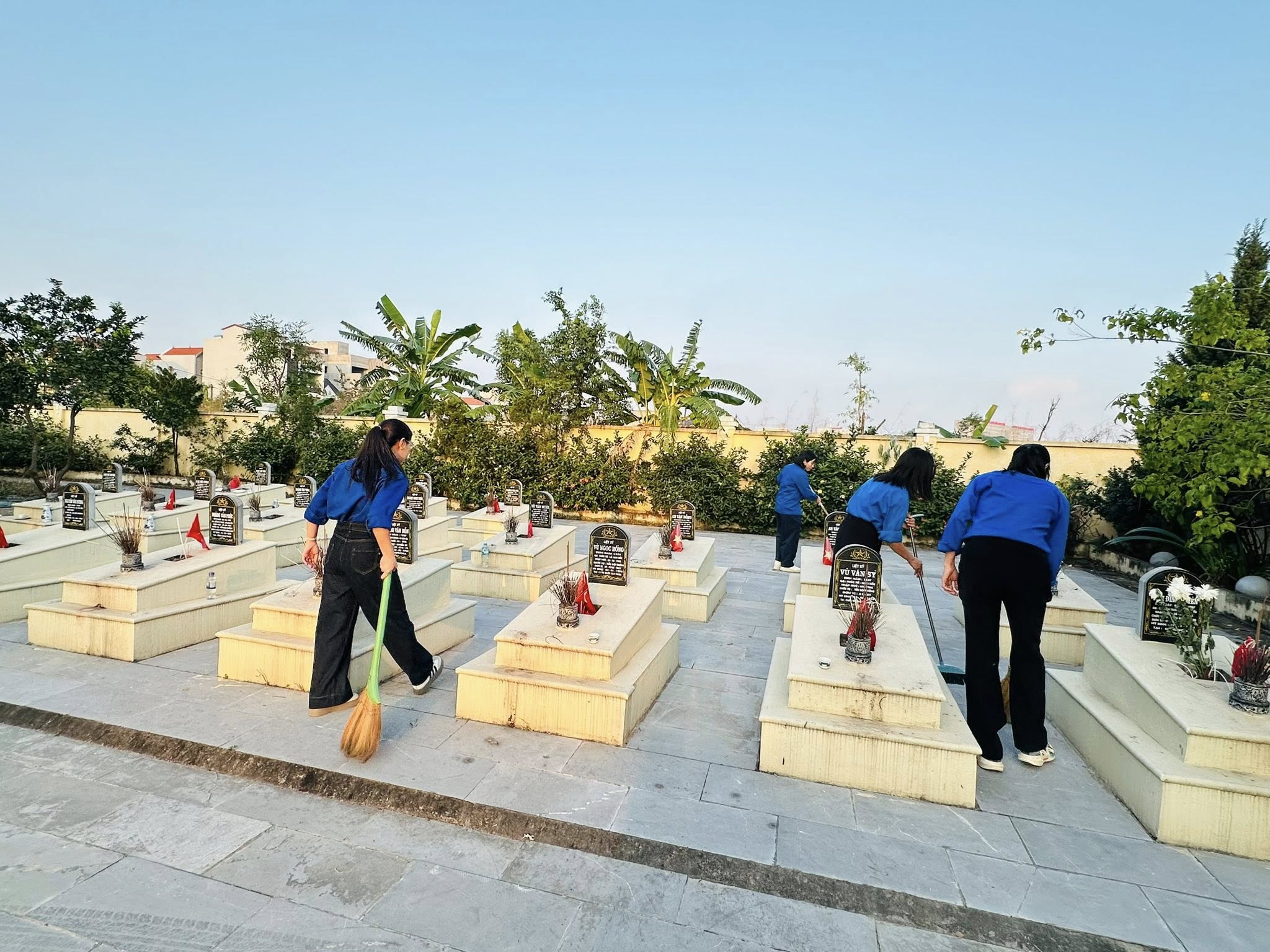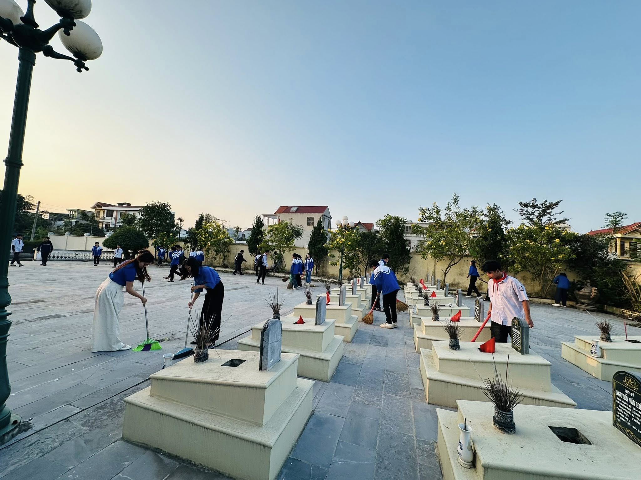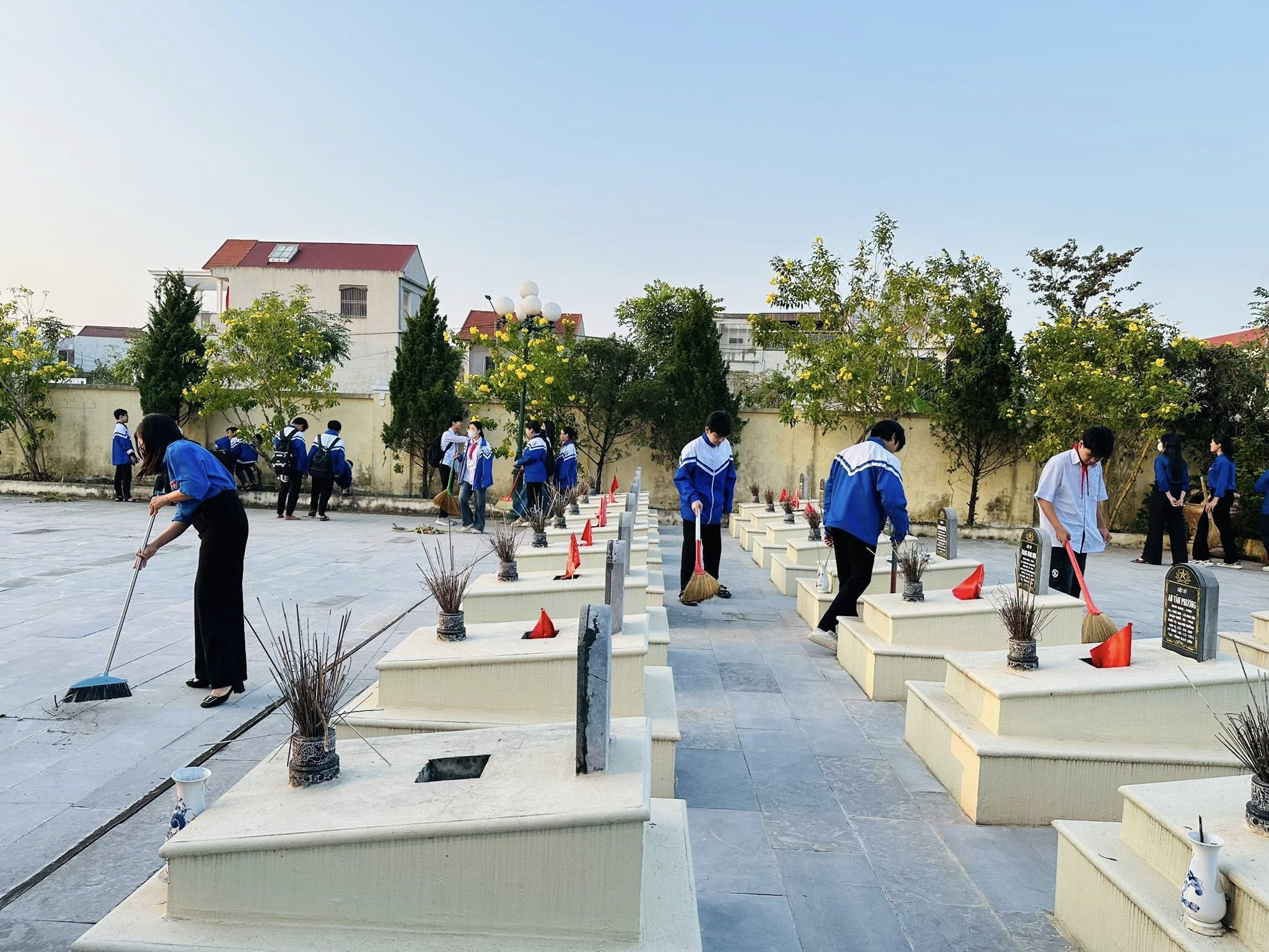 Các em đã cùng nhau dọn vệ sinh, nhặt cỏ, thu gom rác và chăm sóc cây xanh, góp phần giữ gìn cảnh quan sạch đẹp, trang nghiêm.