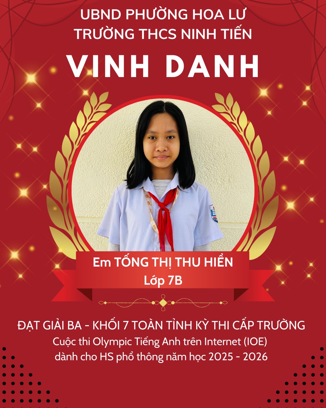 TRƯỜNG THCS NINH TIẾN VINH DANH HỌC SINH ĐẠT GIẢI VIOLYMPIC TOÁN TIẾNG VIỆT VÀ TOÁN TIẾNG ANH CẤP TRƯỜNG